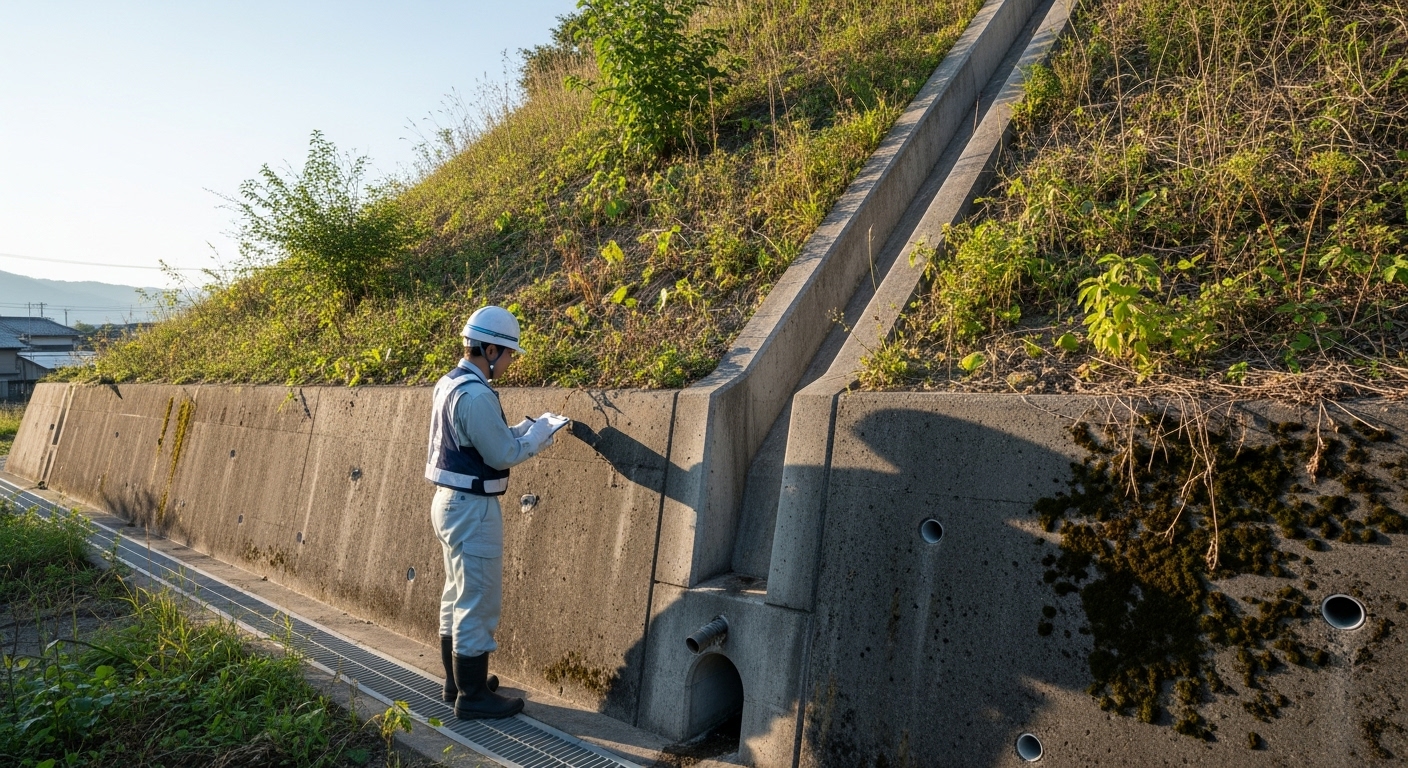 三つ目が排水です。傾斜地は水の通り道が問題になりやすく、排水が弱いと擁壁の背面水圧や法面の洗掘が疑われます。現況で雨水がどこへ流れているか、側溝や集水桝の位置、隣地への越境排水の可能性、敷地内に水が溜まる箇所がないか、といった点を確認し、写真と簡易図に落とします。ここは専門的に見せる必要はありません。雨の日に水が溜まりやすい場所を把握し、買主様にその事実を伝えられるだけで、建築会社は対策の見積りを立てやすくなります。結果として、見積りが早く出て、検討が前に進みます。