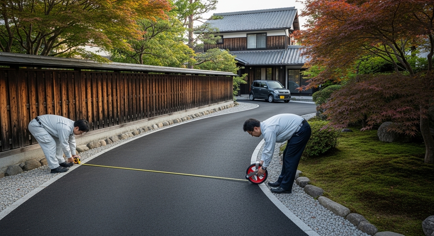 まず、接道の事実確認です。前面道路の幅員は実測か、道路台帳や現地測量で裏付けがあるか。道路種別(公道・私道、建築基準法上の道路)と、セットバックの要否、後退後の有効宅地面積がどれくらい残るか。旗竿地であれば、通路の幅と長さ、共有の場合は持分と通行掘削の承諾関係がどうなっているか。車の進入が可能かは、単に幅だけではなく、曲がり角、隅切り、電柱位置、隣地ブロックの張り出しなどで変わります。ここまで写真と簡易図で示せると、買主様は現地に行く前に判断できます。