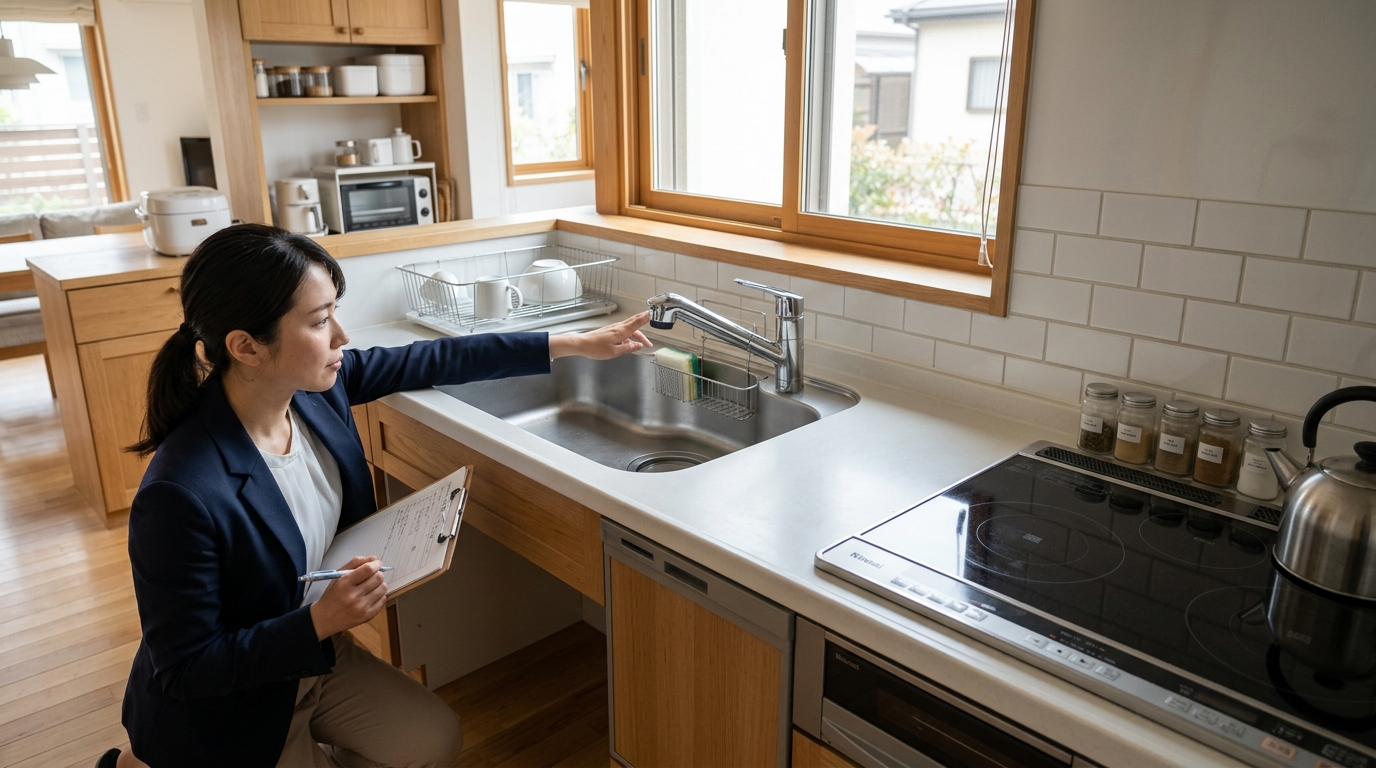 室内では、間取り、設備の状態、リフォーム履歴、使用状況などを細かく確認します。特に水回り(キッチン・浴室・トイレ)は買主が重視するポイントであり、使用感やメンテナンス状況によって印象が大きく変わります。