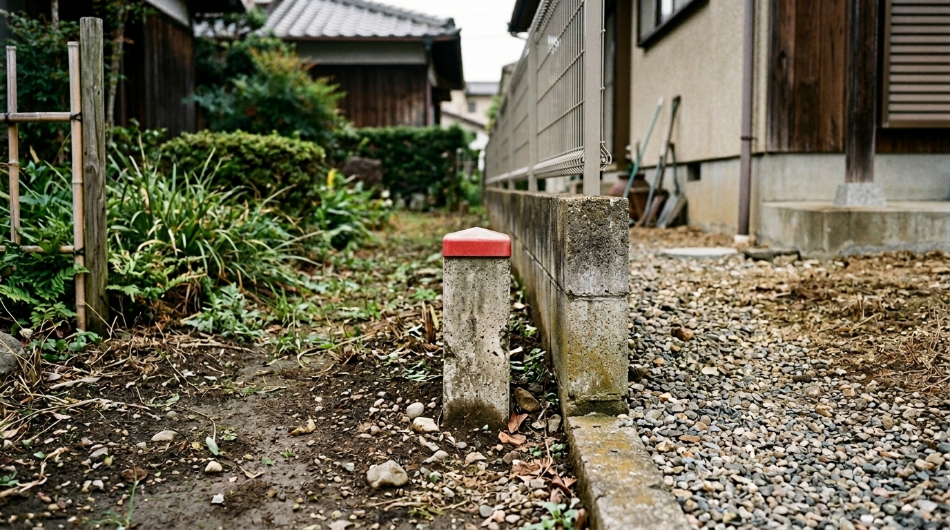 現地確認の中で見落とされやすいのが、境界や越境、インフラに関する問題です。特に境界については、確定測量がされているかどうかでリスクの大きさが変わります。境界標が不明確な場合、引渡し後に隣地所有者とトラブルになる可能性があります。